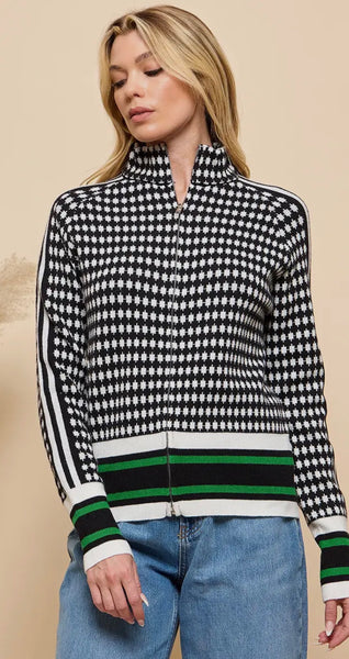 Turn heads in this trendy Butter Soft Zip Up Long Sleeve Sweater featuring Varsity Stripe detailing and a striking Houndstooth pattern.