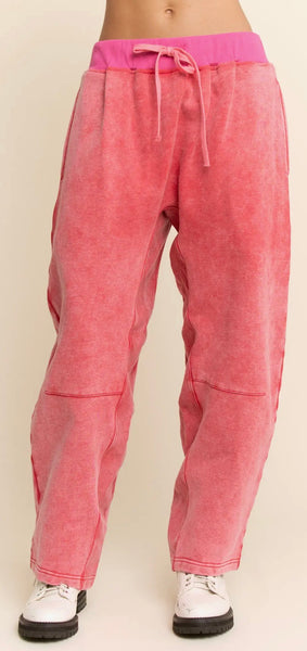 DAVI & DANI ~ Mineral Washed French Terry Contrast Waist Barrel Pants Red/Hot Pink