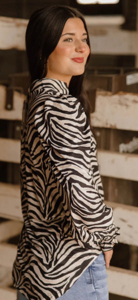 Make a bold statement with the Canyon Call Top in striking zebra print. This long sleeve essential features a playful animal pattern that pairs effortlessly with your favorite denim or neutrals. The fitted cuff sleeves add a polished touch, keeping things put-together while you go about your day. Perfect for layering or wearing solo, this versatile piece brings instant personality to any outfit. Whether you're heading to brunch or the office, the Canyon Call Top delivers style with an adventurous edge.