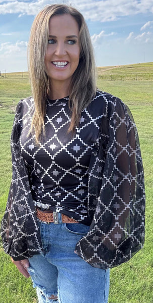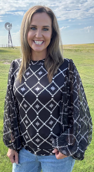 Elevate your style with The Way It Is Top, featuring a dynamic black and white Aztec pattern that adds bold, graphic appeal. The bubble sleeve design offers a trendy silhouette that balances volume with sophistication, perfect for making a statement anywhere. Lightweight and comfortable, this top effortlessly combines eye-catching style with easy wearability to enhance your everyday wardrobe.