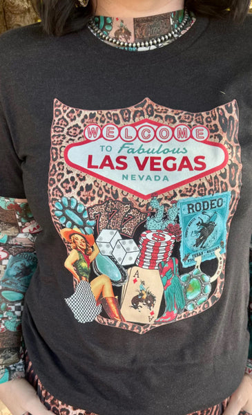 Saddle up for Vegas style with our Viva Las Cowgirl Tee. This short sleeve essential features a bold leopard back number graphic celebrating the National Finals Rodeo with iconic Vegas imagery—rodeo posters, dice, poker chips, horseshoes, and playing cards. Perfect for rodeo enthusiasts and desert lovers who want to make a statement. Whether you're heading to the NFR or just channeling that fearless cowgirl energy, this tee combines Western grit with Sin City glamour for an unforgettable look.