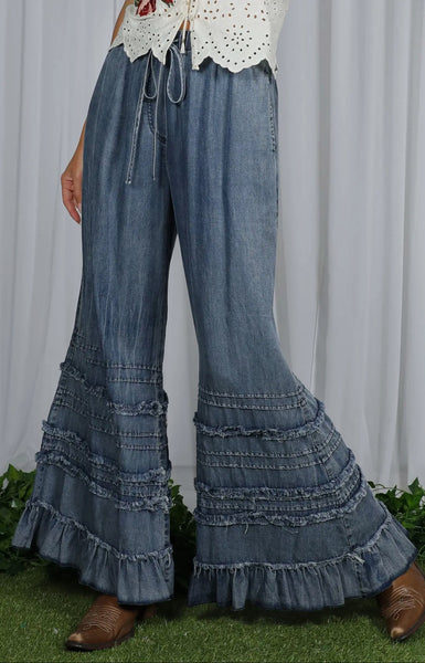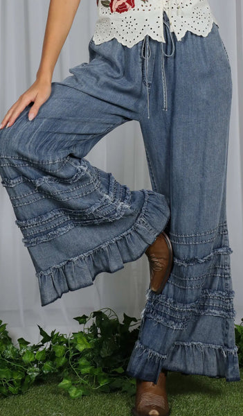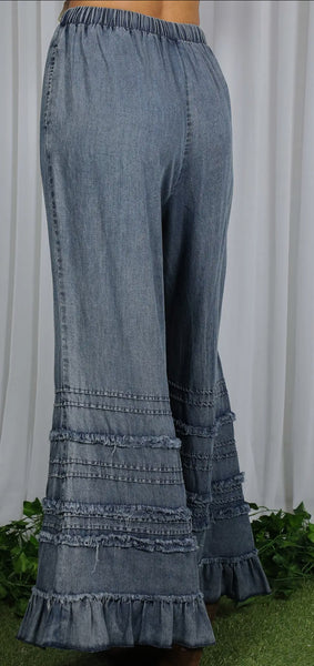 Vine & Love ~ Flared Ruffle Hem Washed Chambray Crop Denim Pants