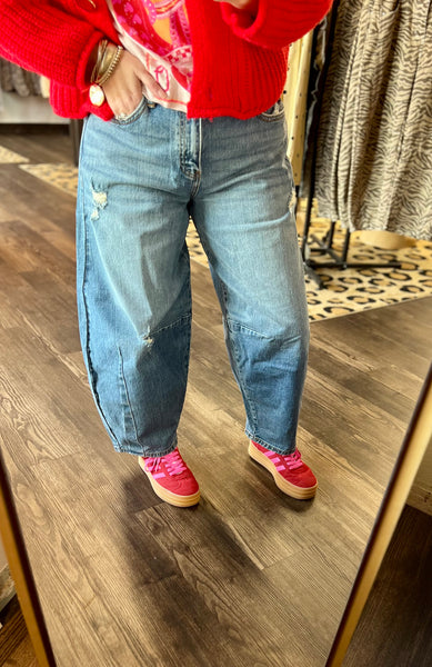 high rise horseshoe fit jeans Medium wash Comfort stretch Zipper fly Dart detail Rise 11" inseam 26 1/2" in size 5/26 99% cotton, 1% spandex