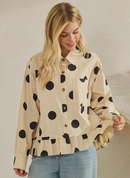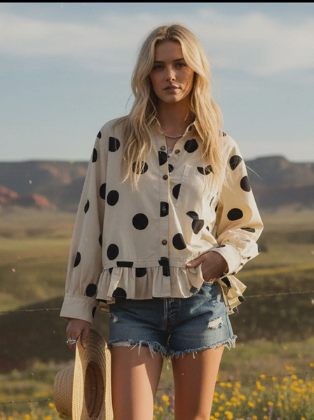 Polka Dot Ruffle Hem Long Sleeve Shirt