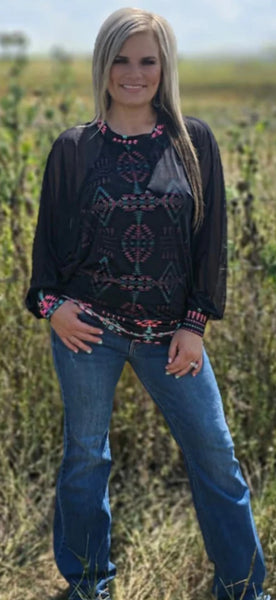 The Lucky To Have You Top is a stylish essential you’ll want to wear again and again. Its fitted black tank features a bright, colorful Aztec print that instantly brightens your look. Layered with a flowy mesh overlay and finished with a stretchy band at the bottom and matching cuffs on the sleeves, this top offers both comfort and flair. Elevate your wardrobe with a piece that effortlessly combines bold design and flattering fit.